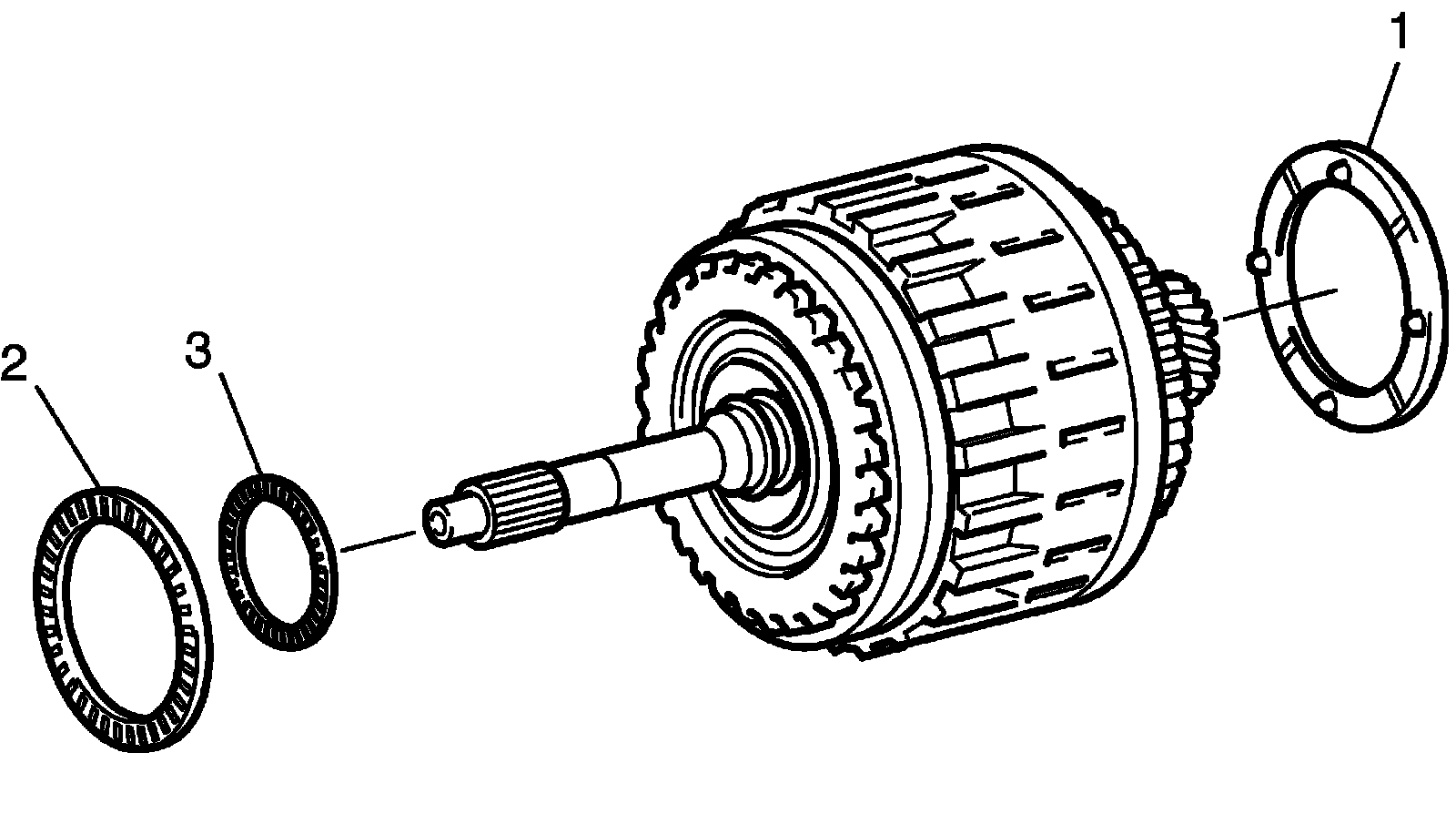 66) Install thrust needle roller bearing No.1 (2) and thrust needle roller bearing No.2 (3) clutch dram and input shaft assembly.