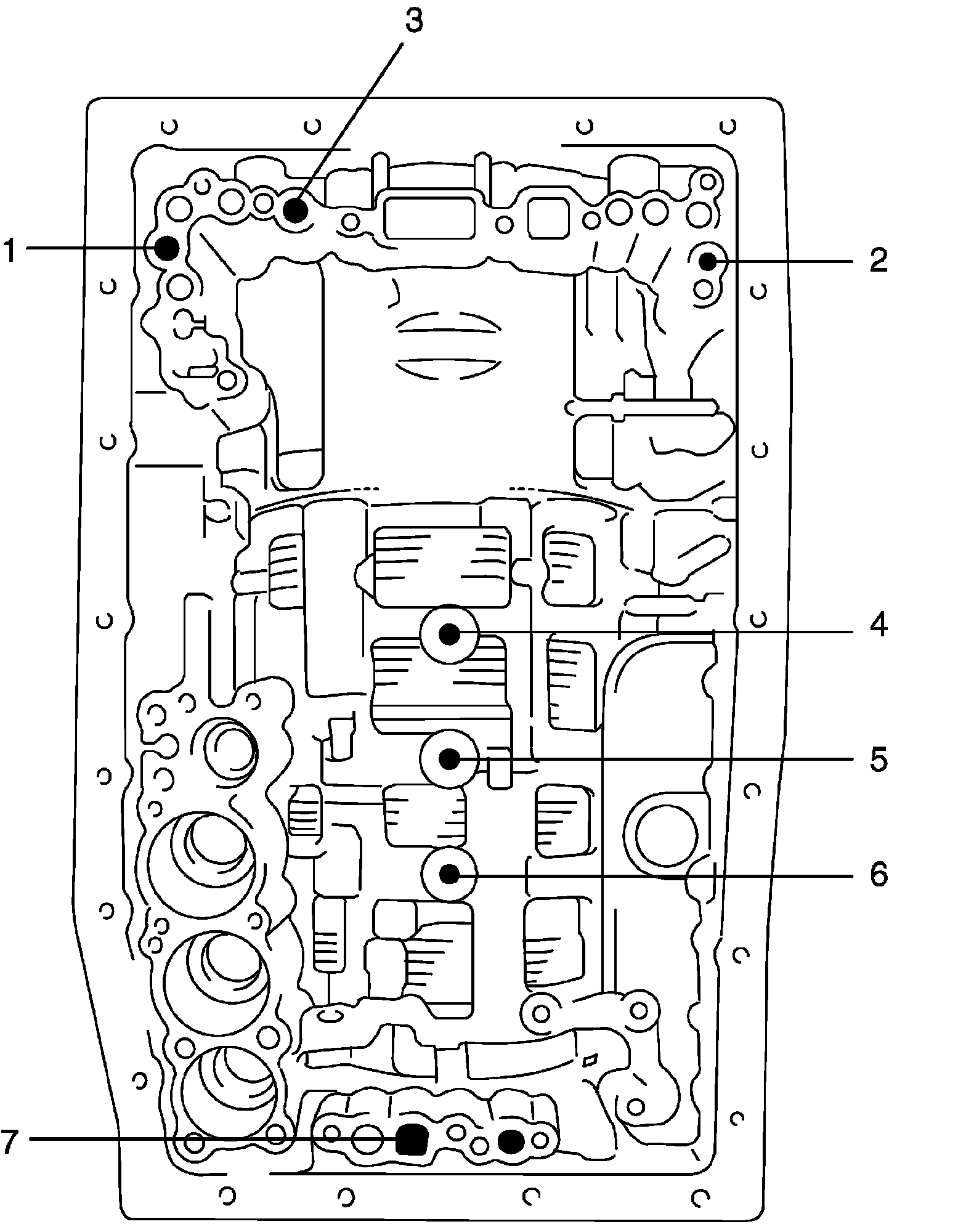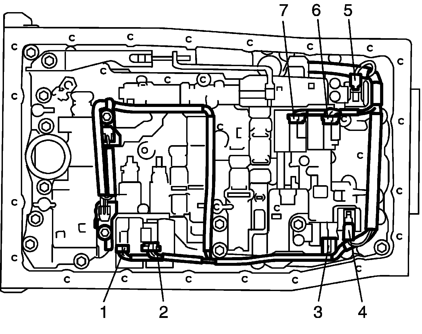 92) Connect pressure control solenoid-A connector (1), pressure control Solenoid-B connector (2), shift solenoid-A connector (3), shift solenoid-B connector (4), shift solenoid-E connector (5), TCC solenoid connector (6) and pressure control solenoid-C connector (7) to each solenoid valve.