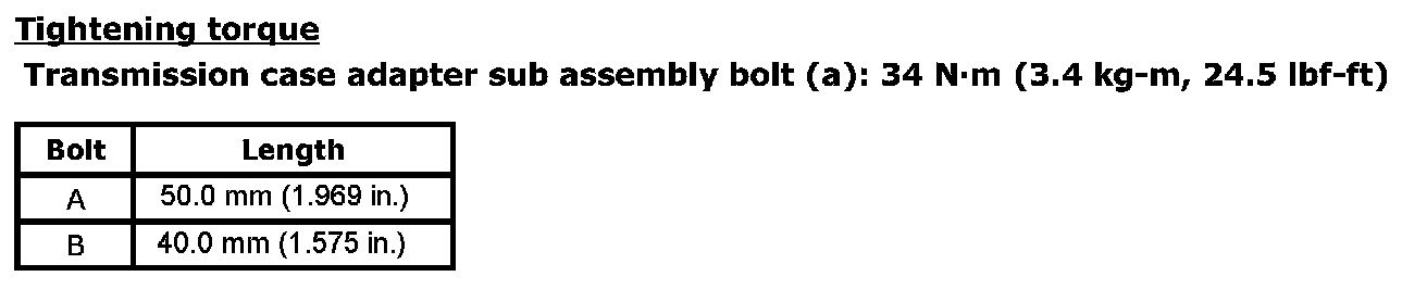 Transmission case adapter sub assembly bolt (a): 34 Nm (3.4 kg-m, 24.5 ft. lb.)