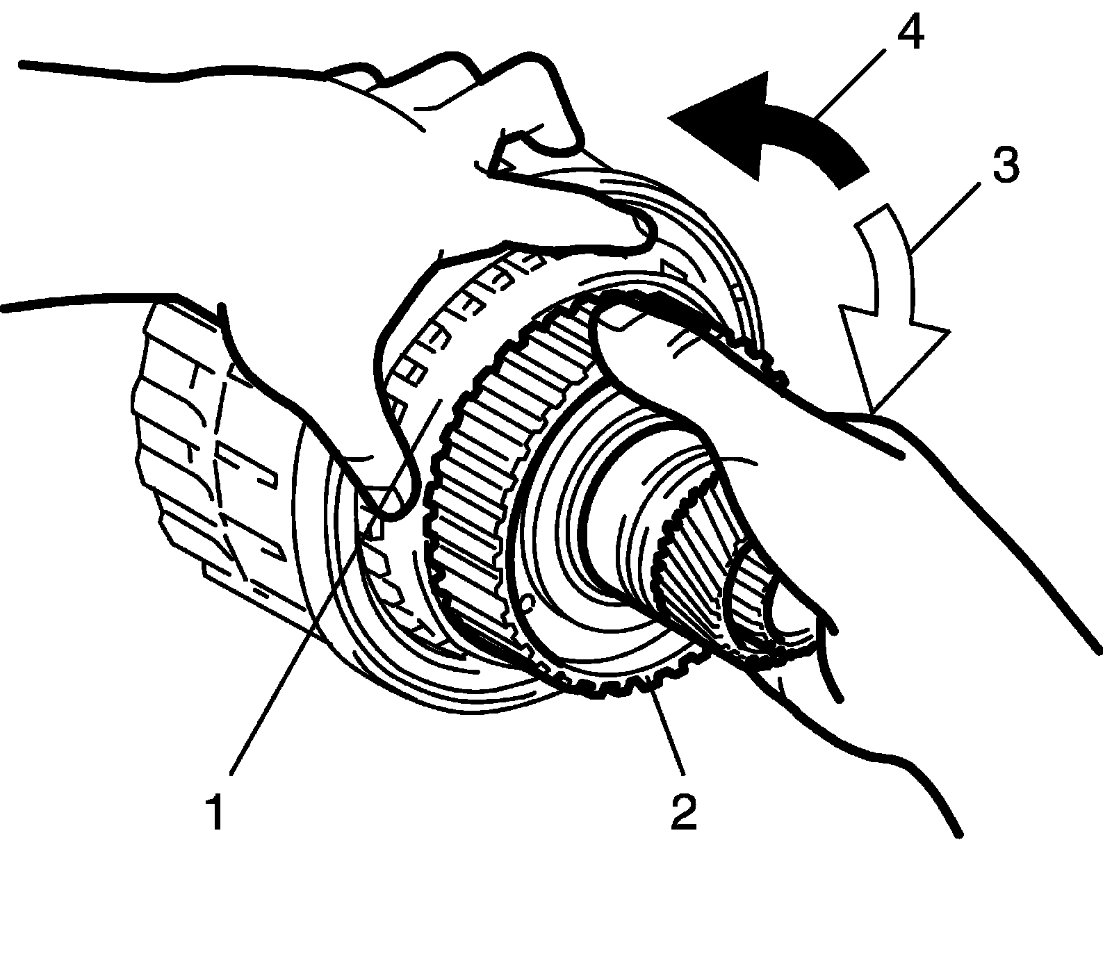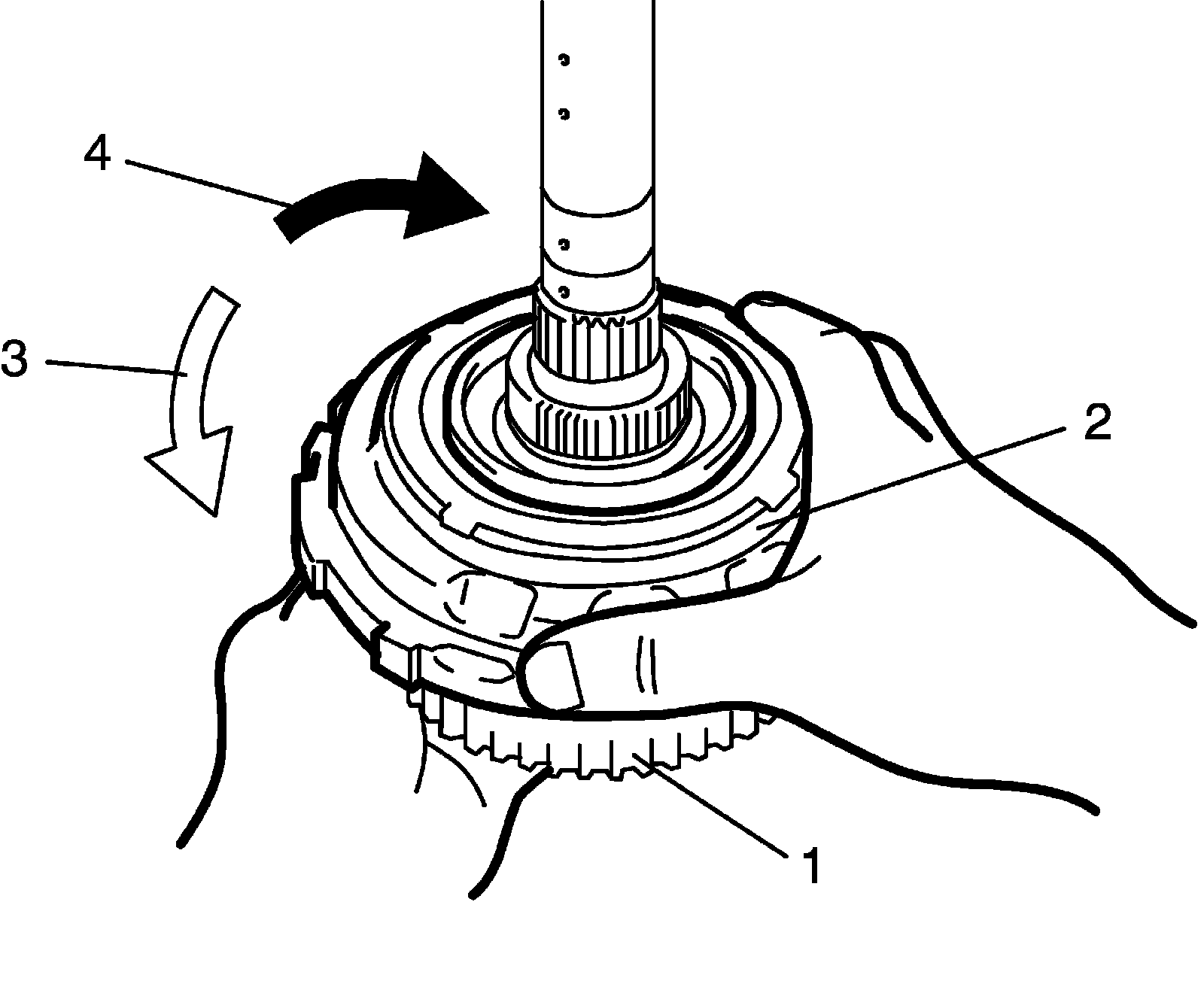 Automatic Transmission Unit Assembly Inspection^ Hold reverse clutch hub (1), and turn one-way No.2 clutch assembly (2). Check that one-way No.2 clutch assembly (2) can be turned freely (3) clockwise and locked (4) counterclockwise.