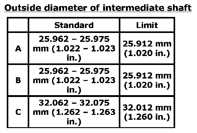 ^ Measure outside diameter of intermediate shaft positions shown in figure. If outside diameter is below limit, replace intermediate shaft with new one.