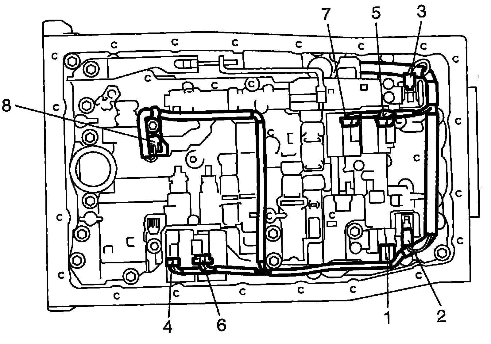 9) Disconnect shift solenoid-A connector (1), shift solenoid-B connector (2), shift solenoid-E connector (3), TCC solenoid connector (4), Pressure control solenoid-A connector (5), Pressure control solenoid-B connector (6) and Pressure control solenoid-C connector (7).