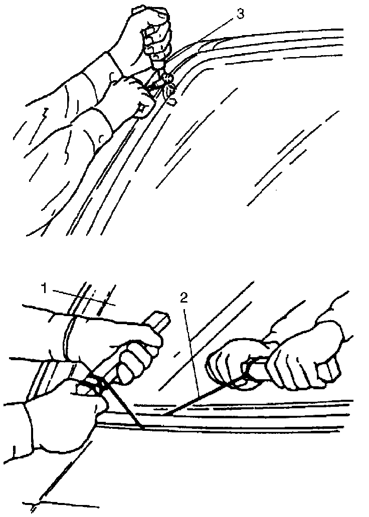 10. Cut adhesive all around windshield (1) with piano string (2). When using tool, windshield knife (3), to cut adhesive, be careful not to cause damage to windshield. Use wire to cut adhesive along lower part of windshield.