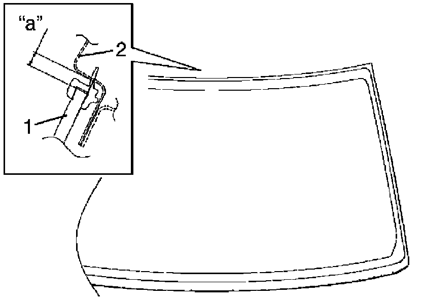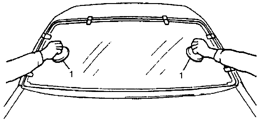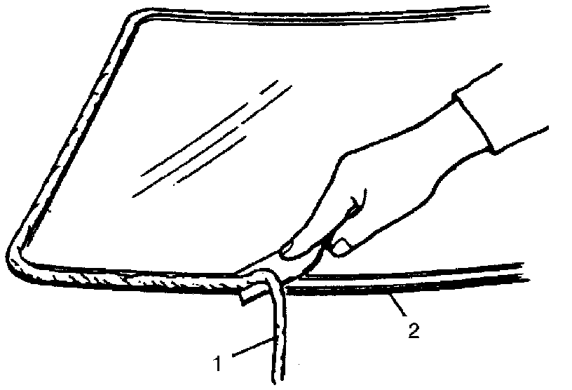 12. When reusing windshield, remove the adhesive (1) from it, using care not to damage primer coated surface (2).