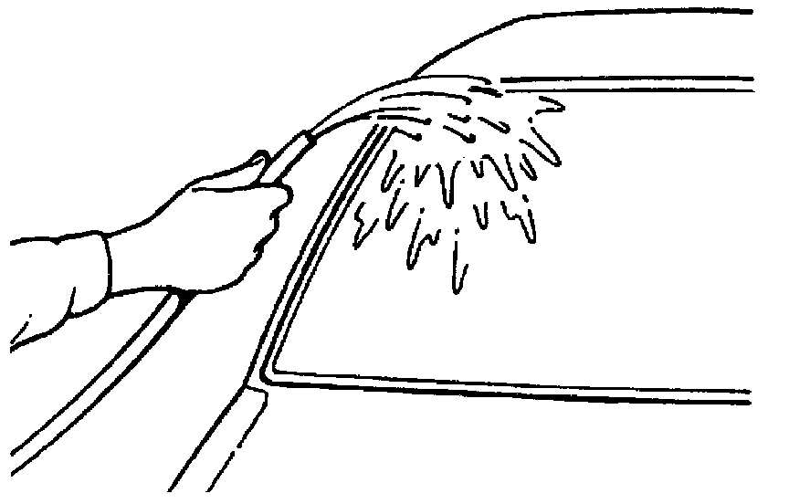 11. Check for water leakage by pouring water over windshield through hose. If leakage is found, dry windshield and fill leaky point with adhesive. If water still leaks even after that, remove glass and start installation procedure all over again.