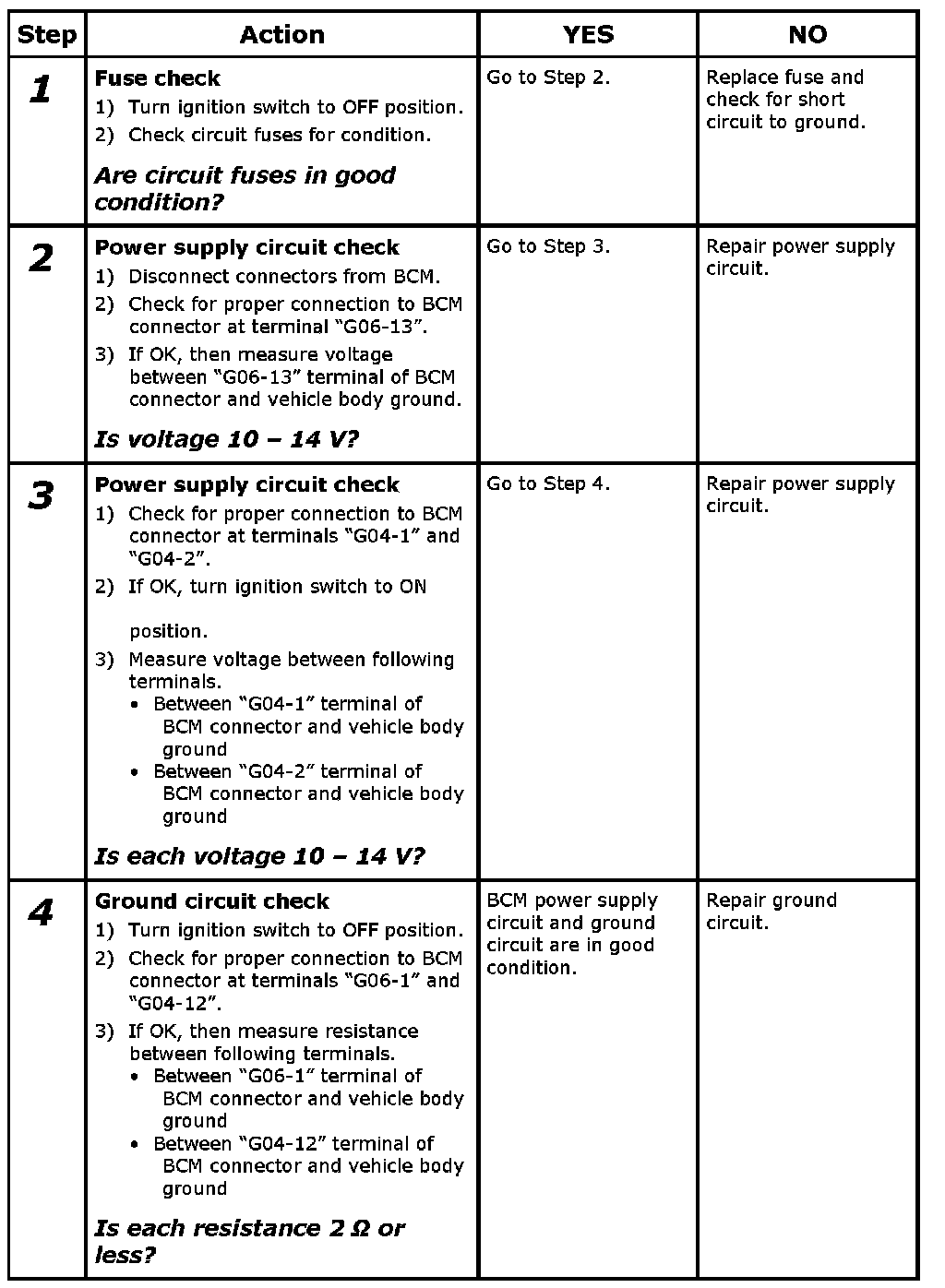 BCM Power Circuit and Ground Circuit Check