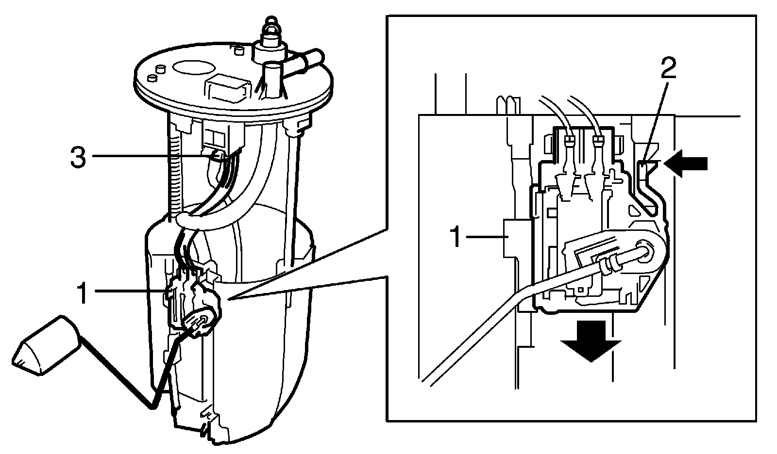 3. With pressing snap-fit part (2), remove main fuel level sensor (1) by sliding it in the arrow direction as shown in figure.