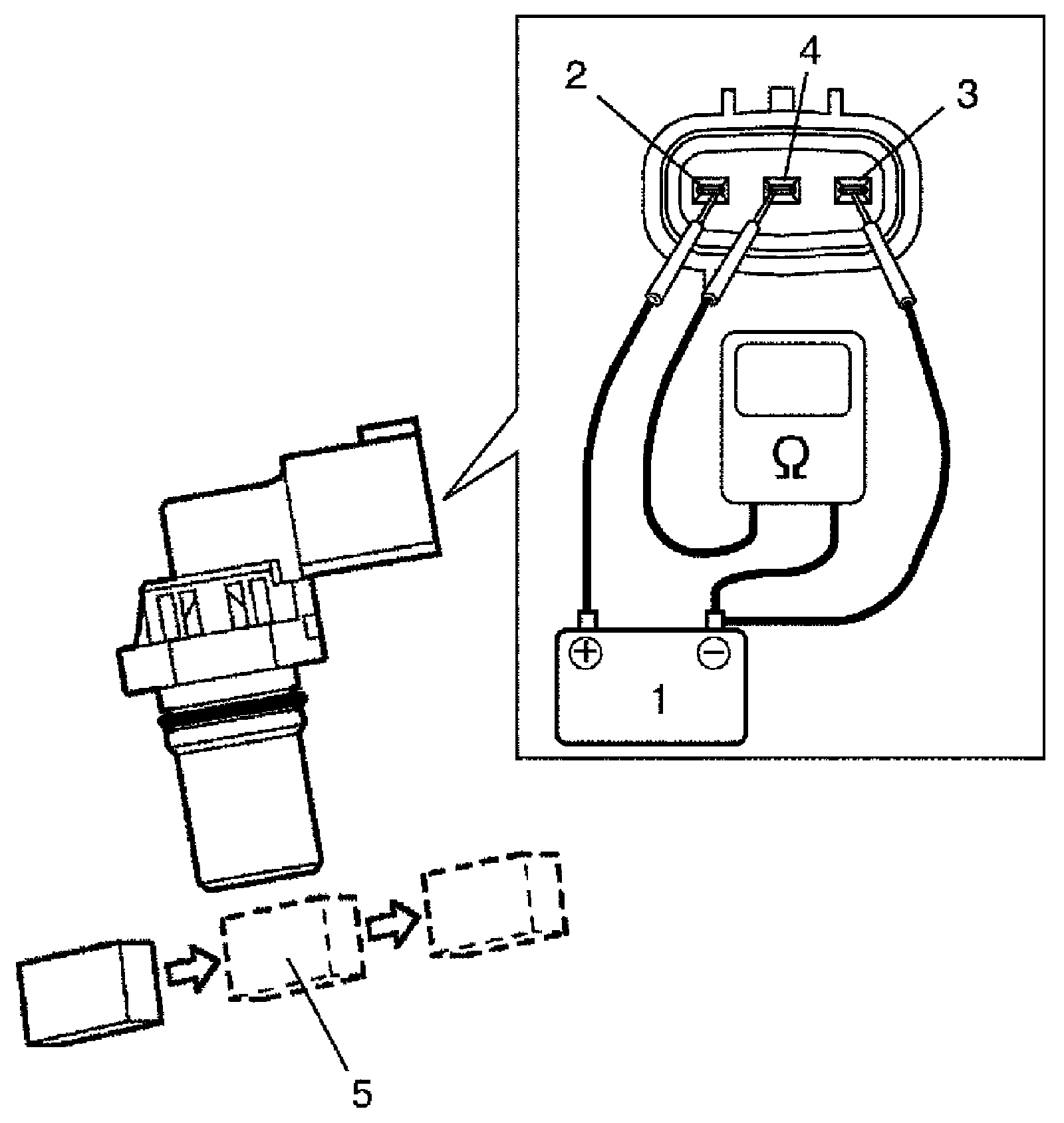 2. Arrange 12 V battery (1) and connect its positive terminal to "Vin" terminal (2) and negative terminal to "Ground" terminal (3) of sensor. Then using ohmmeter, measure resistance between "Vout" terminal (4) of sensor and negative terminal of battery by passing magnetic substance (iron) (5) while keeping approximately 1 mm (0.03 in.) gap with respect to end face of CMP sensor.