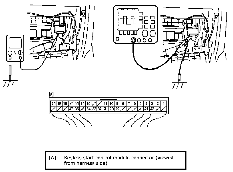 Inspection of Keyless Start Control Module and Its CircuitsKeyless start control module and its circuits can be checked at keyless start control module wiring couplers by measuring voltage and resistance.