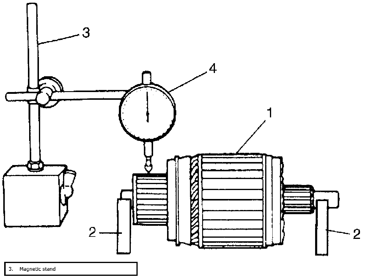 ^ Check commutator for uneven wear with armature (1) supported on V-blocks (2). If deflection of dial gauge (4) pointer exceeds limit, repair or replace.