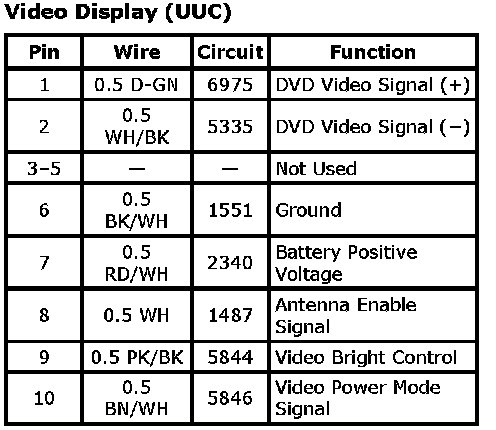 Video Display (UUC)Connector Part Information