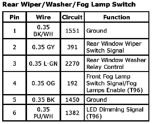 Rear Wiper/Washer/Fog Lamp SwitchConnector Part Information