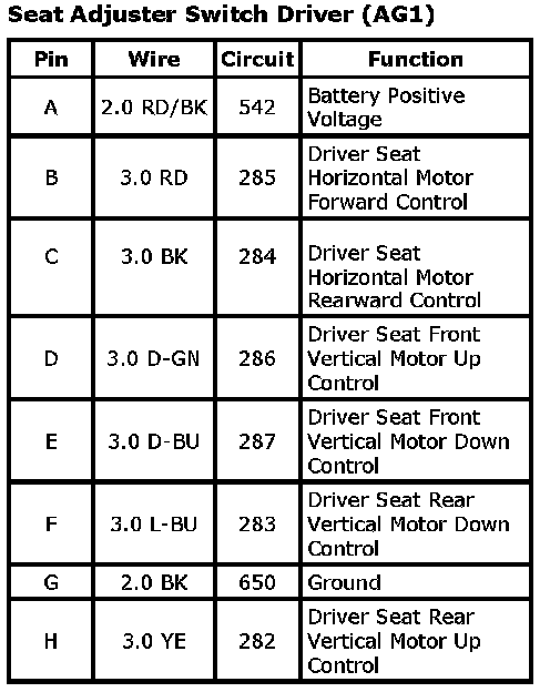 Seat Adjuster Switch Driver (AG1)Connector Part Information