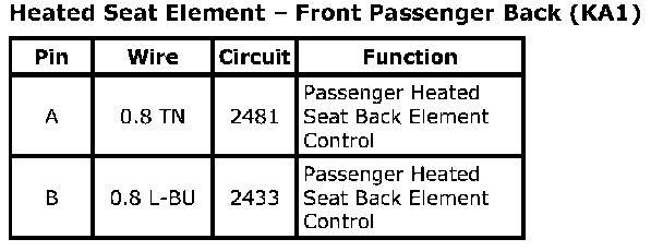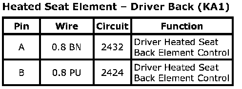 Heated Seat Element - Driver Back (KA1)Connector Part Information