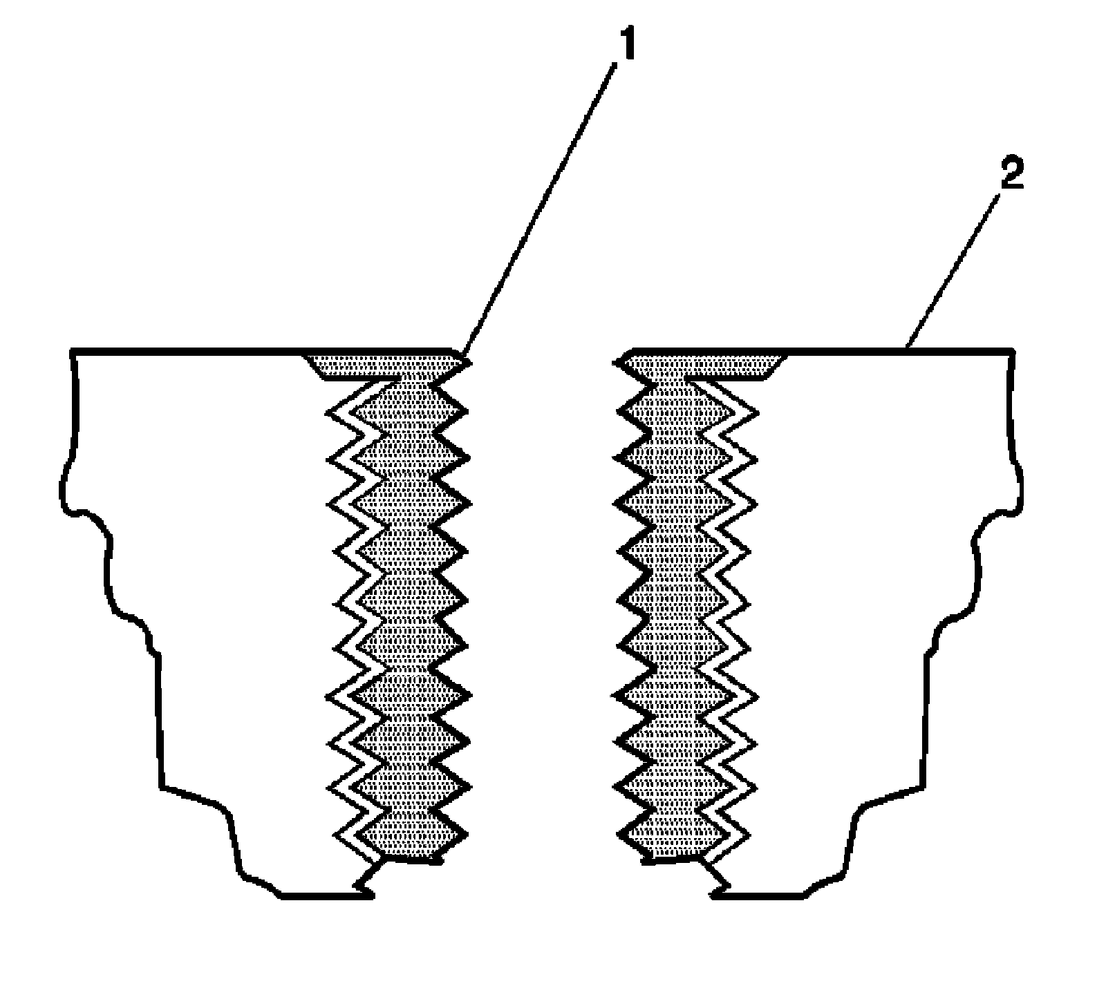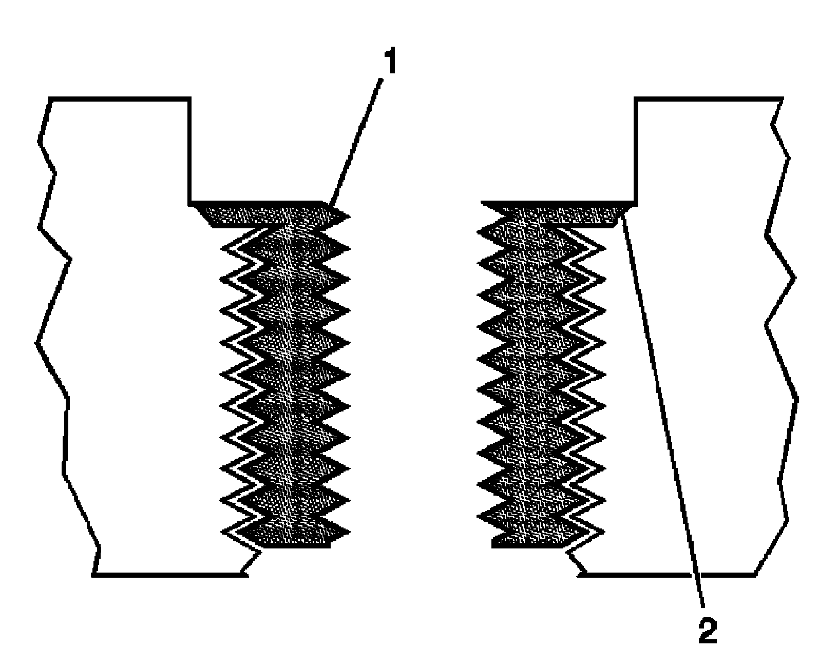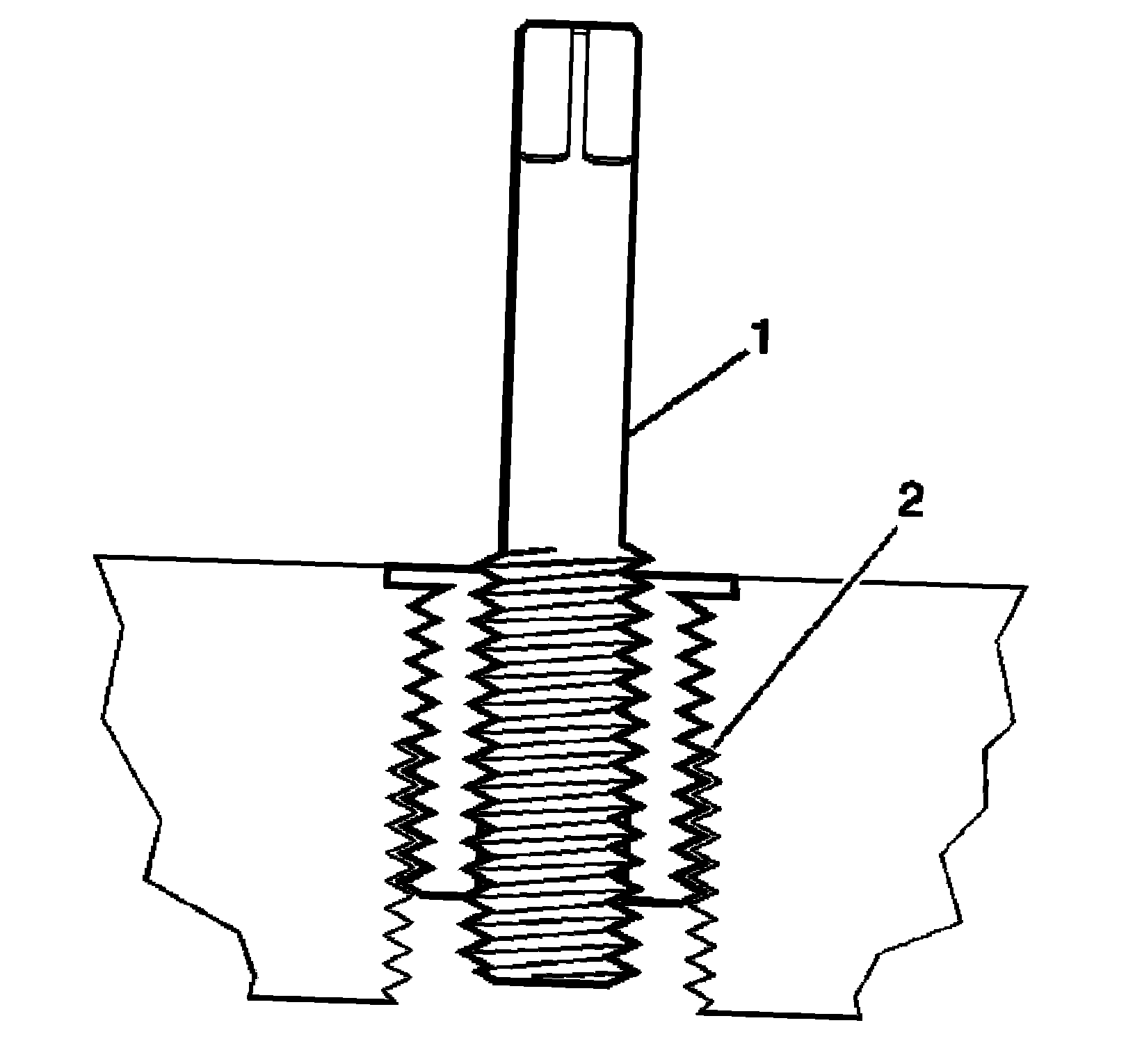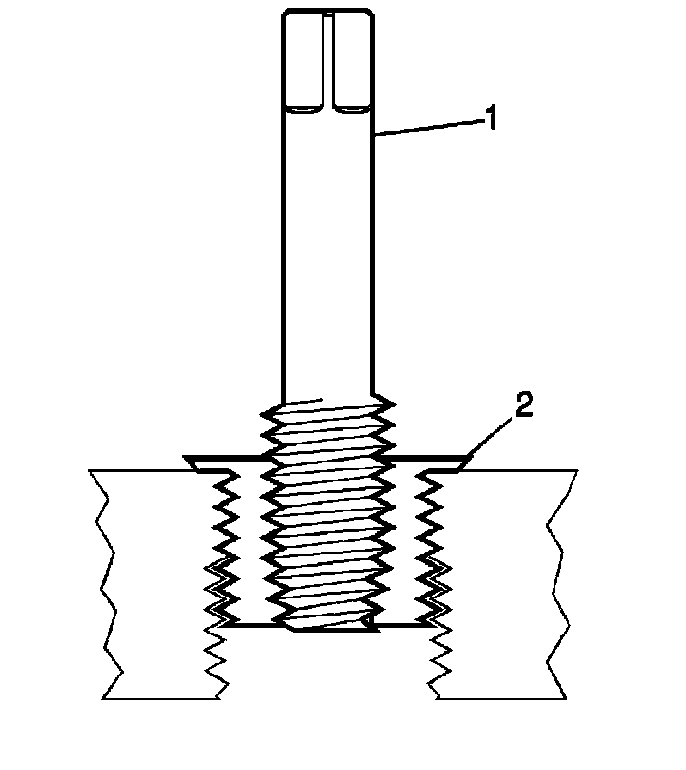 10. Apply threadlock sealant GM P/N 12345493, (Canadian P/N 10953488), J 42385-109, LOCTITE 277(R) or equivalent (1) to the insert OD threads (2).