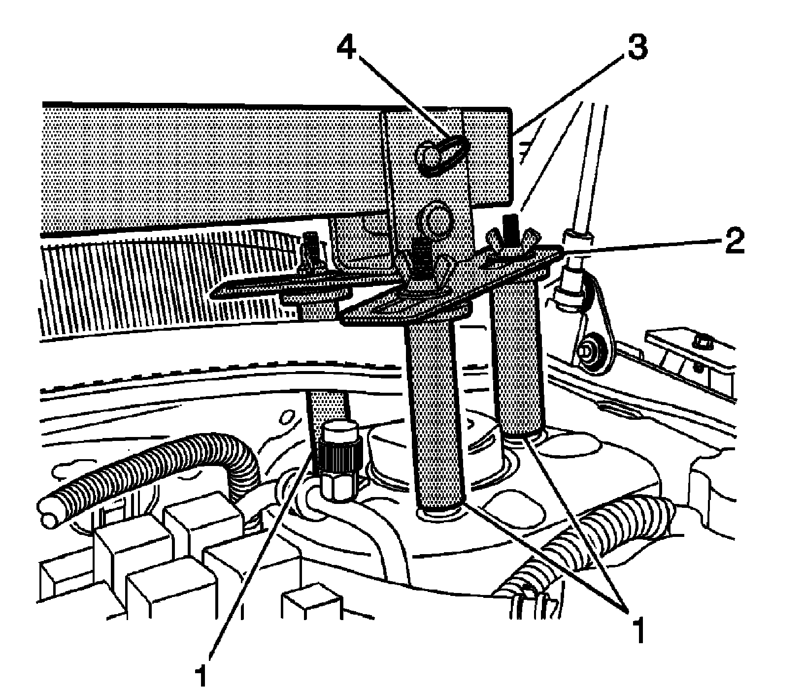 5. Insert safety pins J-28467-10 (4) through the J 28467-5 strut tower adapters (2) and the cross bar (3) to prevent movement.