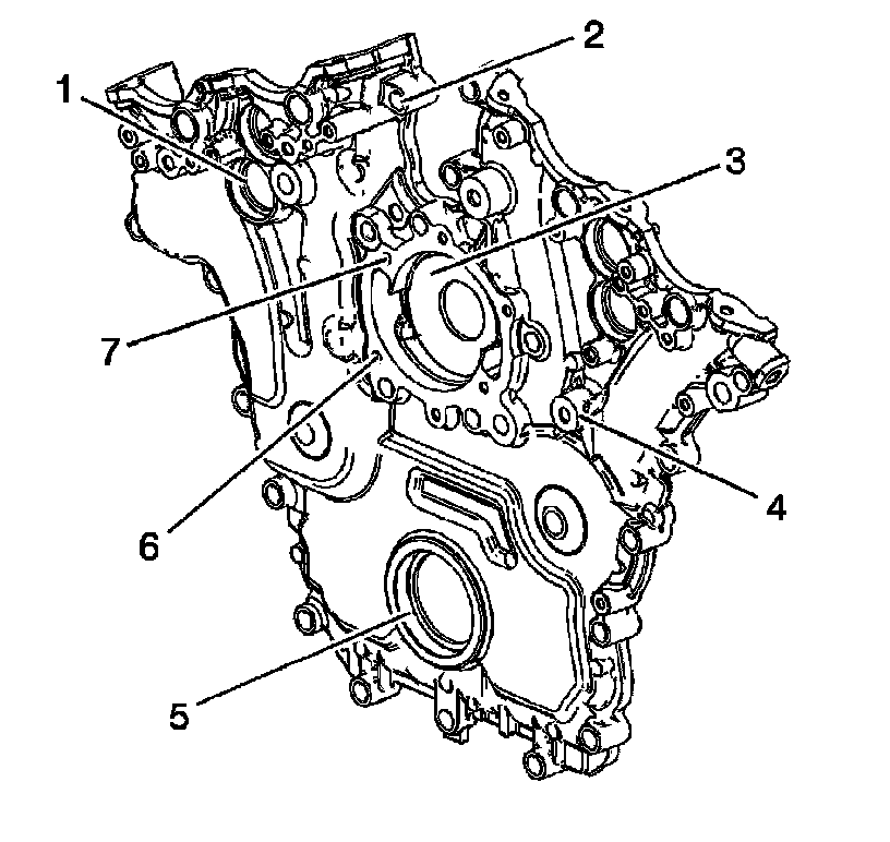 ^ Gouges or damage to the engine front cover sealing surfaces to the engine block (7), oil pan (5), and/or camshaft covers (2)