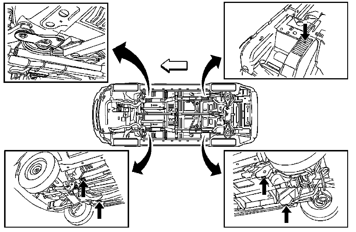 Lifting and Jacking the VehicleWARNING: To avoid any vehicle damage, serious personal injury or death when major components are removed from the vehicle and the vehicle is supported by a hoist, support the vehicle with jack stands at the opposite end from which the components are being removed and strap the vehicle to the hoist.