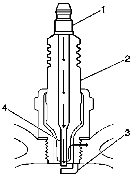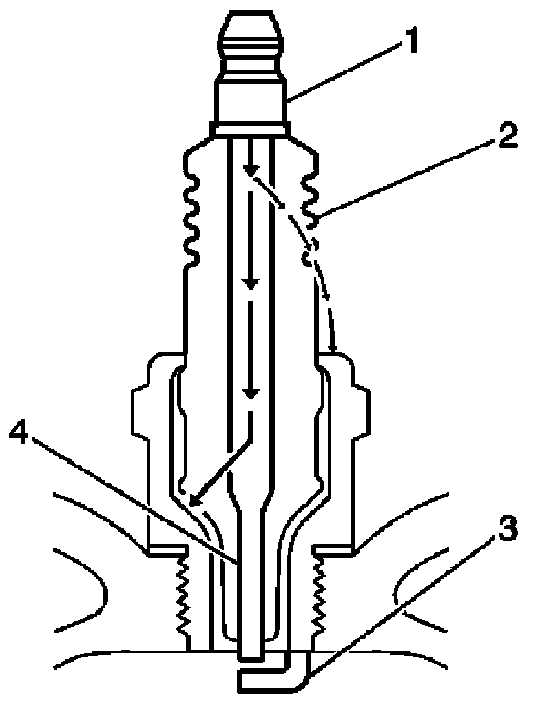 ^ Inspect the insulator (2) for cracks. All or part of the electrical charge may arc through the crack instead of the electrodes (3, 4).