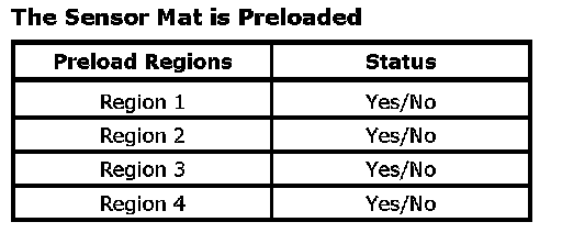 The PPS will fail the preload test when a region has detected a preload/pressure on it. If a preload test fails, the scan tool will display a chart as illustrated below. A Yes status indicates which region(s) have a preload condition. Refer to the chart below and the above illustration to identify the failed region.
