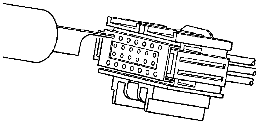 View of the female half of the connector with male terminals.