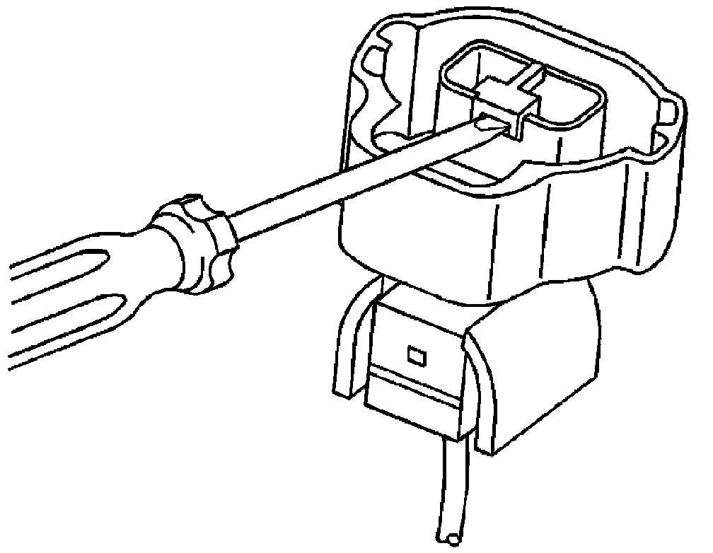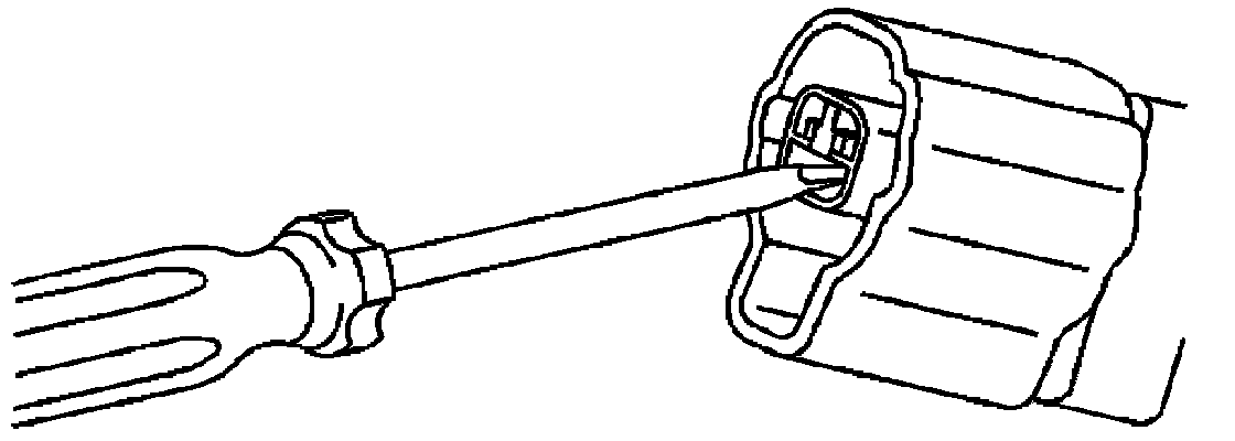 5. Insert the J 38125-553 (GM P/N 15315247) on a slight upward angle into the cavity below the terminal to be removed. Ensure that the pointed on the end of the tool is facing the bottom of the terminal and it stays in contact with the terminal until it stops on the plastic terminal retainer. See the release tool cross reference in the Reference Guide of the J-38125 to ensure that the correct release tool is used.