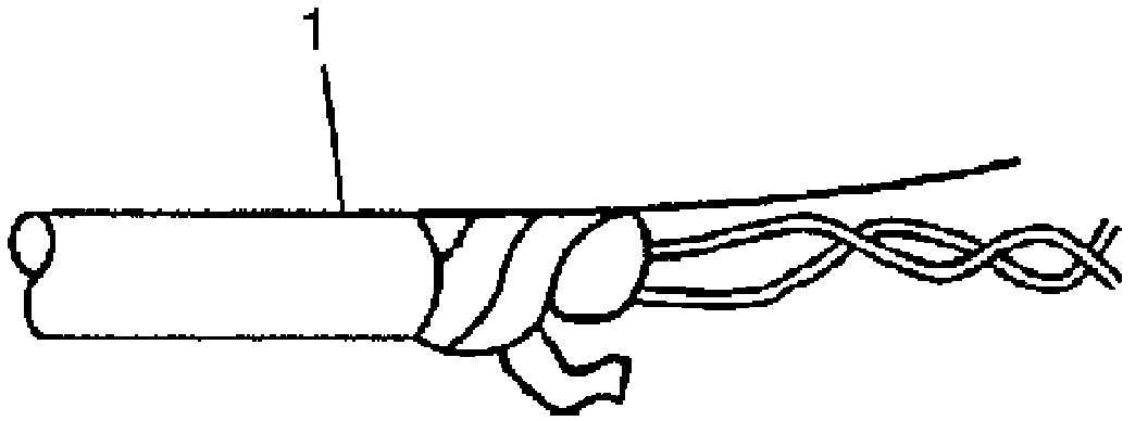 1. Remove the outer jacket (1). Use care not to cut into the drain wire of the mylar tape.