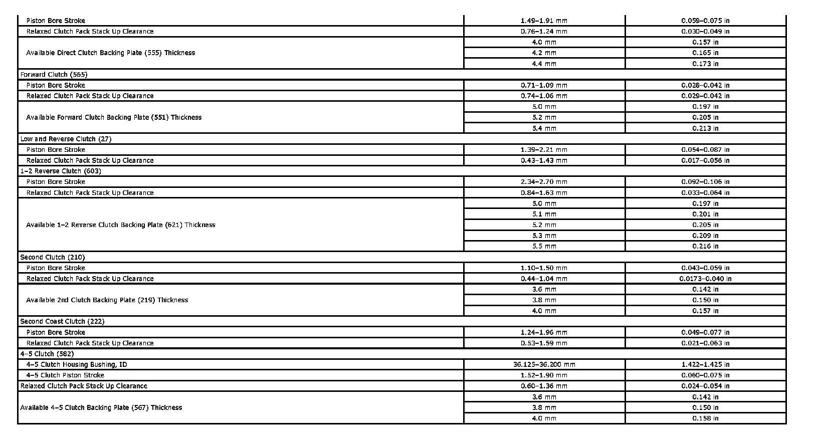 Clutch Assembly Specifications: