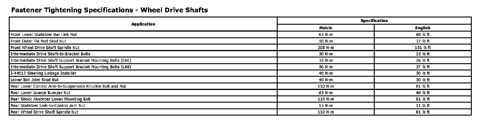 Fastener Tightening Specifications - Wheel Drive Shafts: