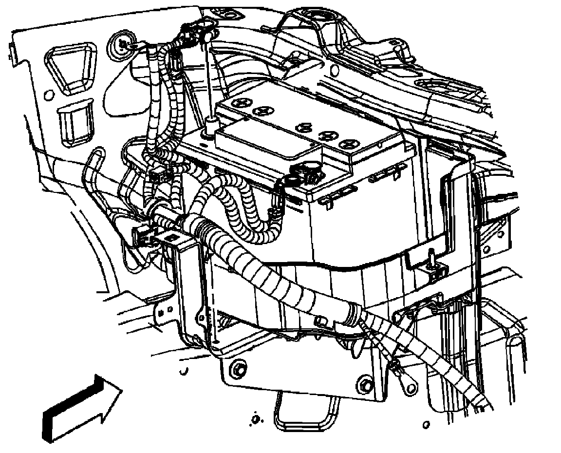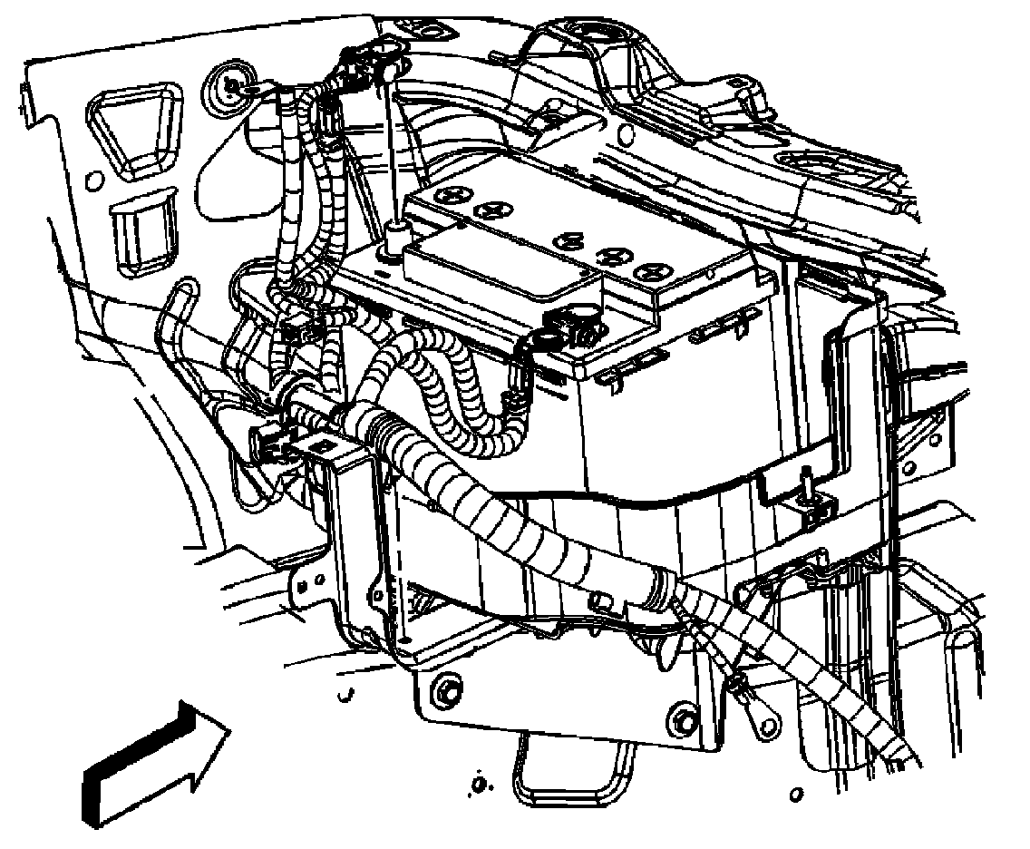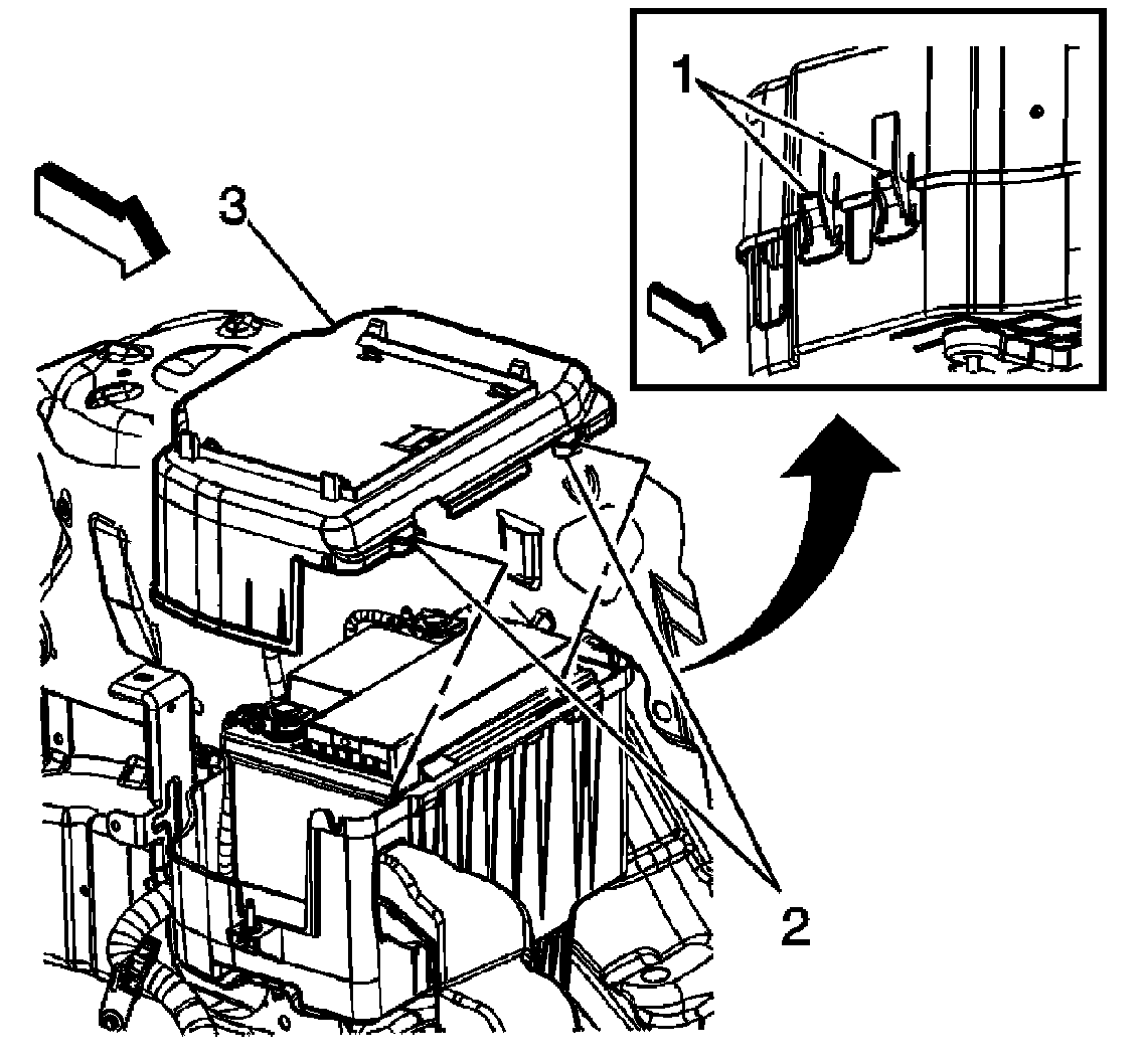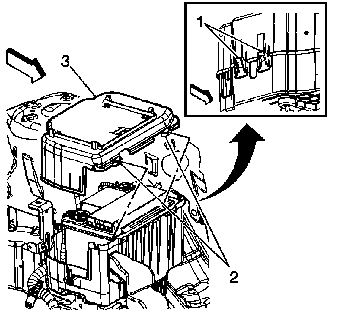 4. Grasp the engine control module (ECM) and slide the retainer rearward until the retainer disengages from the 4 clips on the battery cover. Reposition the ECM out of the way.