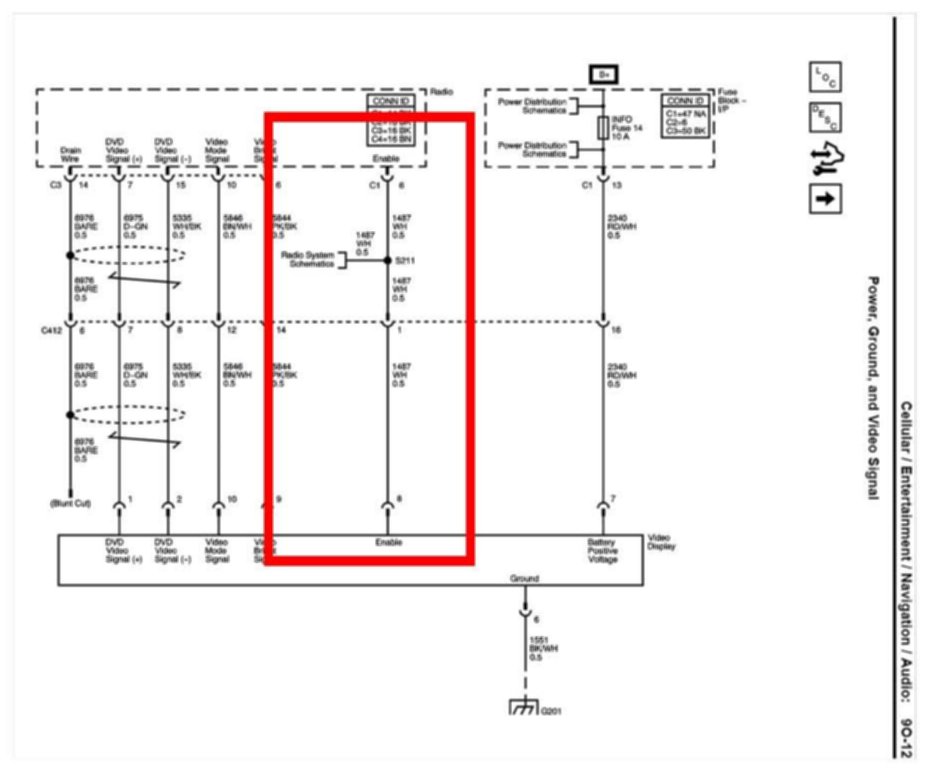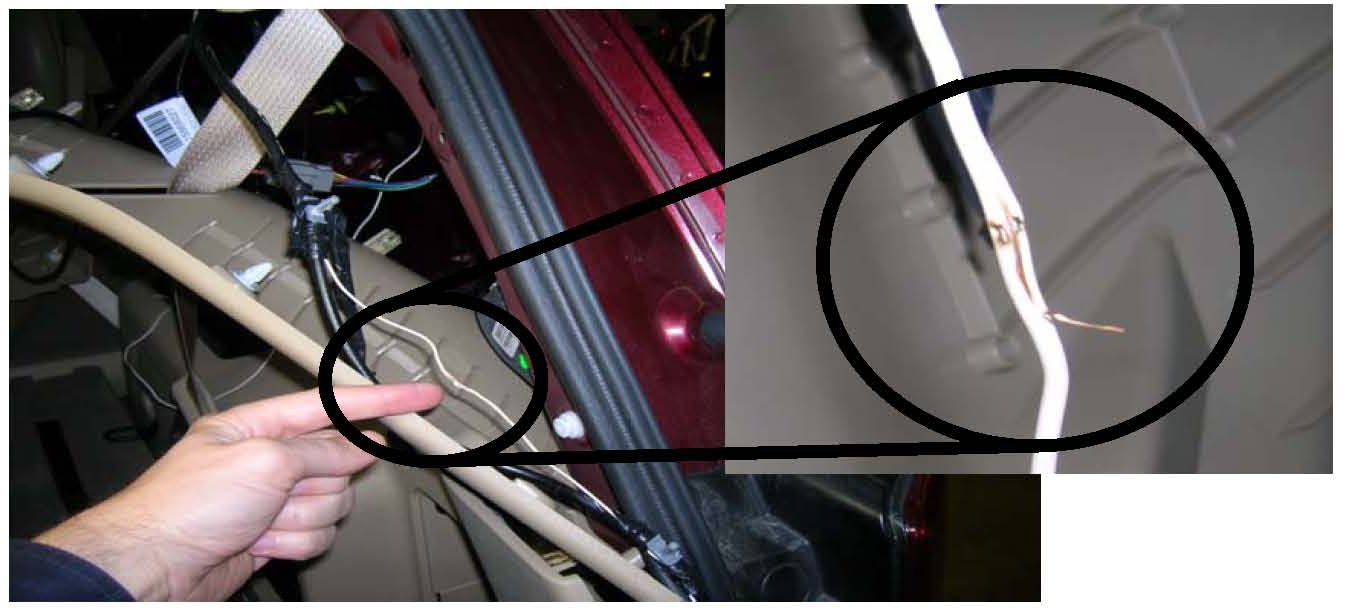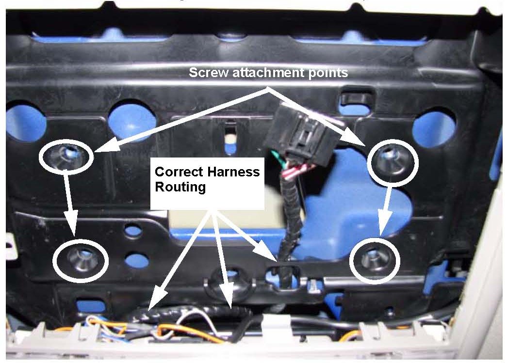 2. For DVD vehicles, check that the harness is not pinched under any attachment screws of the video display module (you need to check the wiring very closely, if it is not routed as seen above, the damage is sometimes difficult to see).