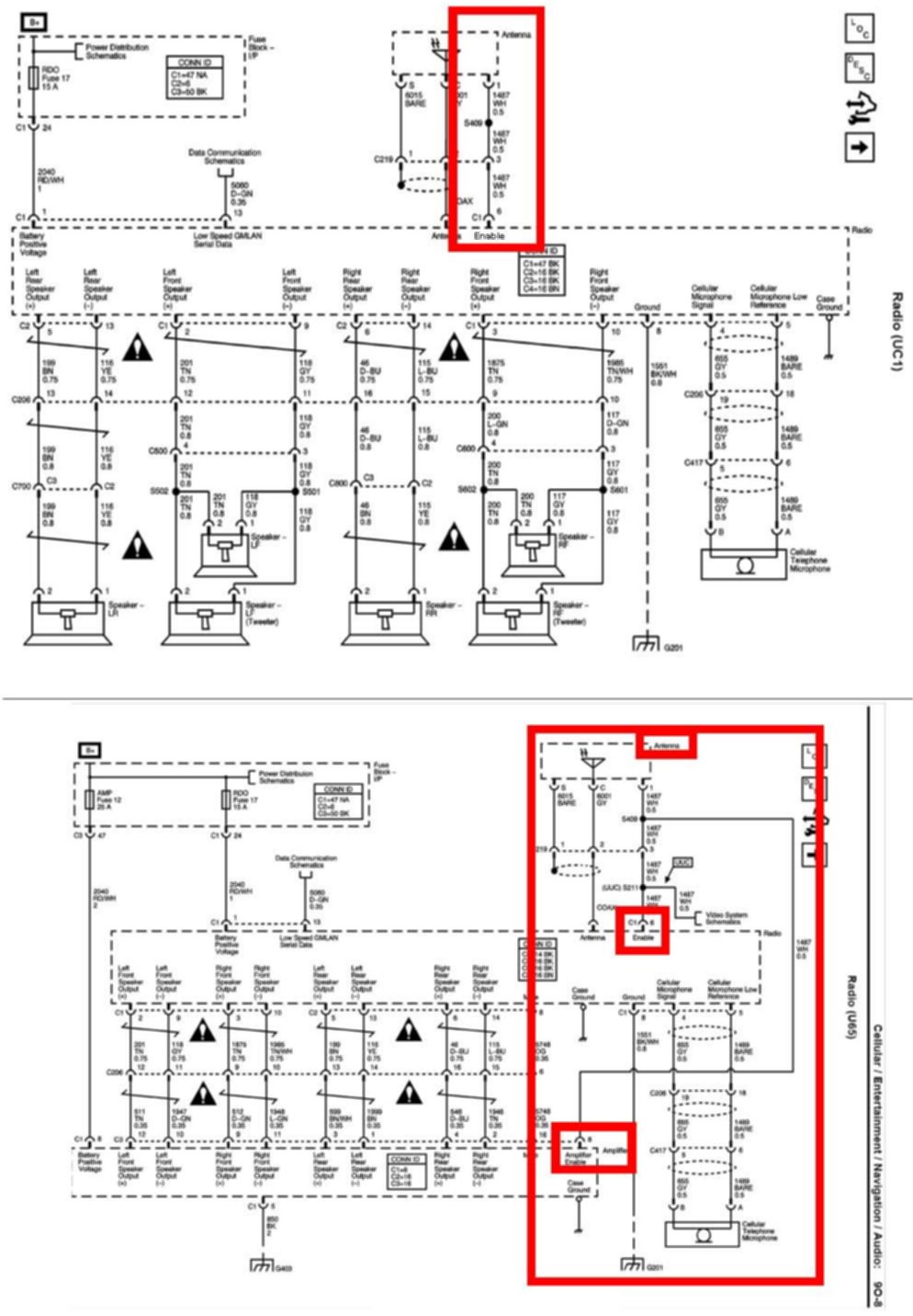 This condition may be due to shorted wiring harness, specifically the white (WH) antenna/amplifier enable wire.