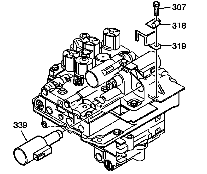 2. Remove the bolt (307), the wiring harness clip (318), and the TCC lock up pressure control solenoid valve retainer (319).