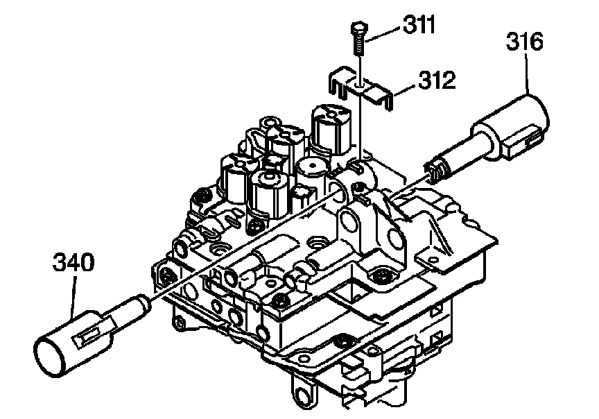 5. Remove the line pressure control solenoid valve assembly (316) and the shift pressure control solenoid valve assembly (340).
