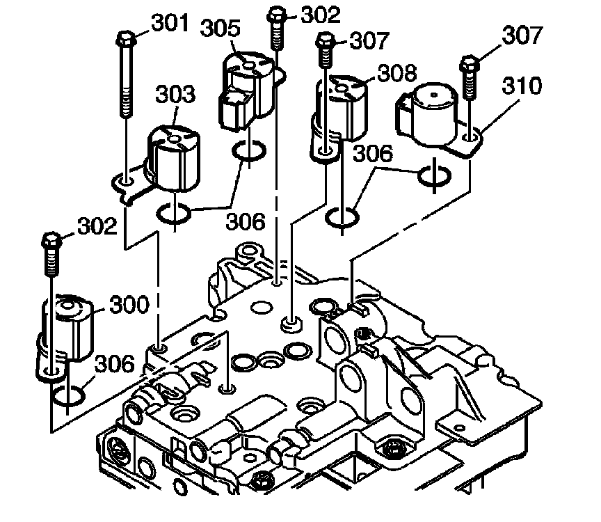 7. Remove the 5 shift solenoid valves (300, 303, 305, 308, 310), and the 5 shift solenoid valve O-ring seals (306).