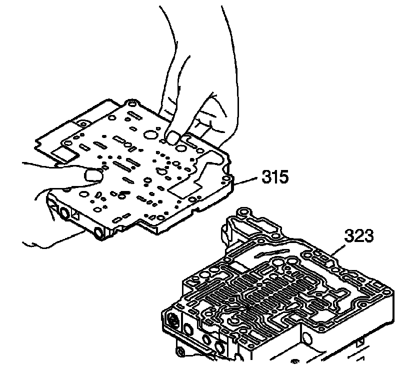 9. Remove the front control valve body assembly (315), spacer plate and gaskets as an assembly from the middle control valve body assembly (323).