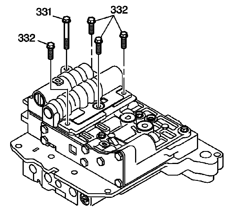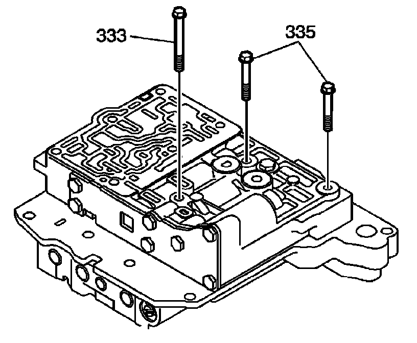 15. Remove the 3 rear control valve body bolts (333, 335).