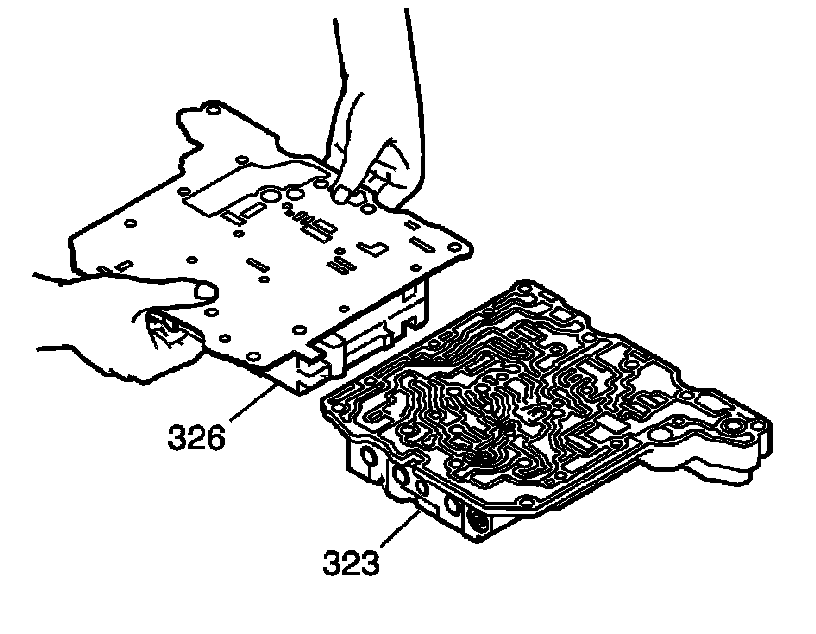 16. Remove the rear control valve body assembly (326) from the middle control valve body assembly (323).