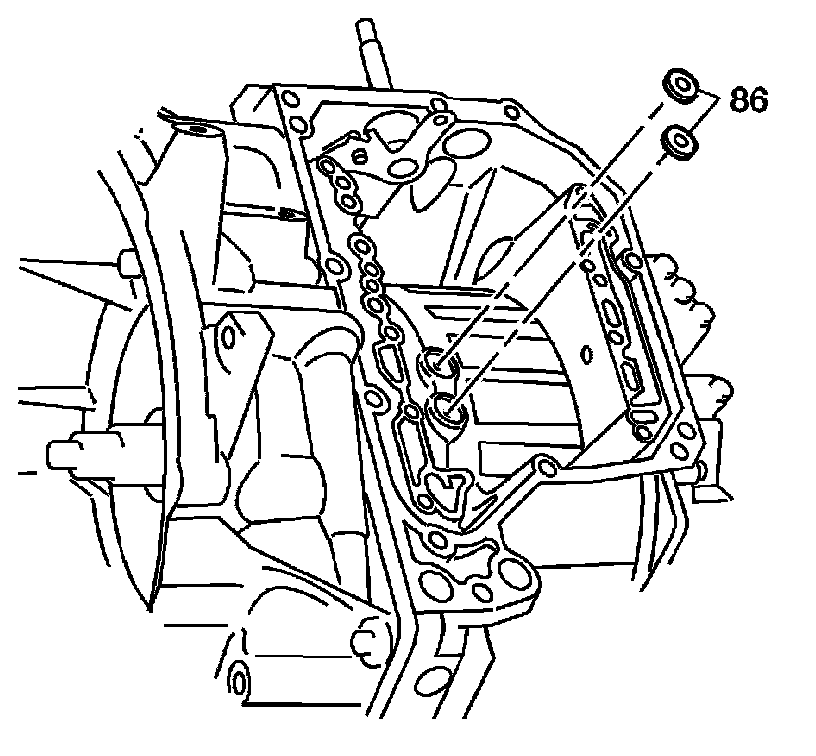 2. Install 2 new case fluid passage seals (86) into the transmission case fluid ports.