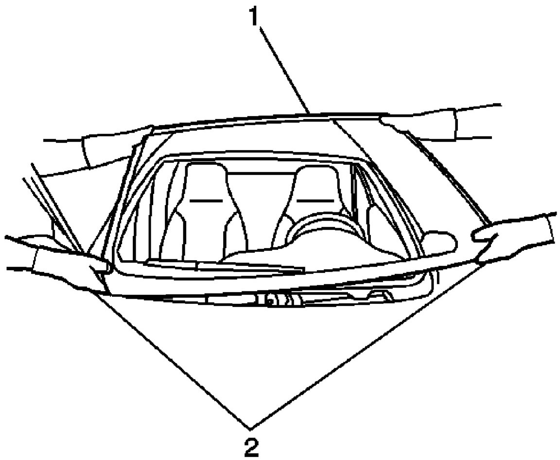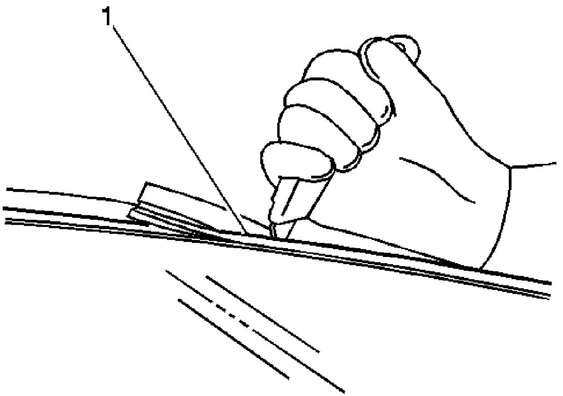 8. Using a utility knife, carefully cut the exposed reveal molding (1) from the sides and the top edge of the windshield to access the urethane adhesive bead.