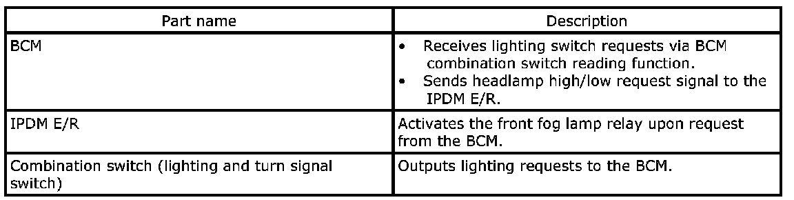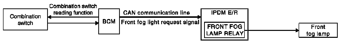 Front Fog Lamp: System DescriptionThe front fog lamps are activated with the lighting switch (combination switch). The lighting switch signal to the BCM is monitored with the BCM combination switch reading function. When the fog lamps are turned ON with the lighting switch, the BCM sends a front fog lamp request signal via CAN communication lines to the IPDM E/R. The IPDM E/R grounds the front fog lamp relay coil to activate the front fog lamps.