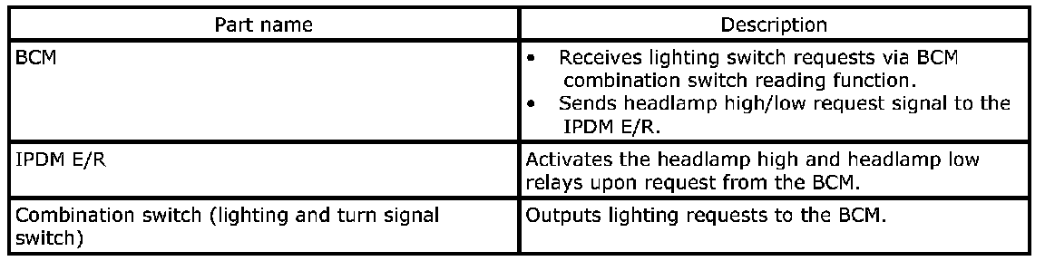 Headlamp: System DescriptionControl of the headlamp system operation is dependent upon the position of the lighting switch (combination switch). When the lighting switch is placed in the 2nd position, the BCM (body control module) receives input requesting the headlamps and park lamps to illuminate. This input is communicated to the IPDM E/R (intelligent power distribution module engine room) via the CAN communication lines. The CPU (central processing unit) of the IPDM E/R controls the headlamp high and headlamp low relay coils. When energized, these relays direct power to the respective headlamps, which then illuminate.