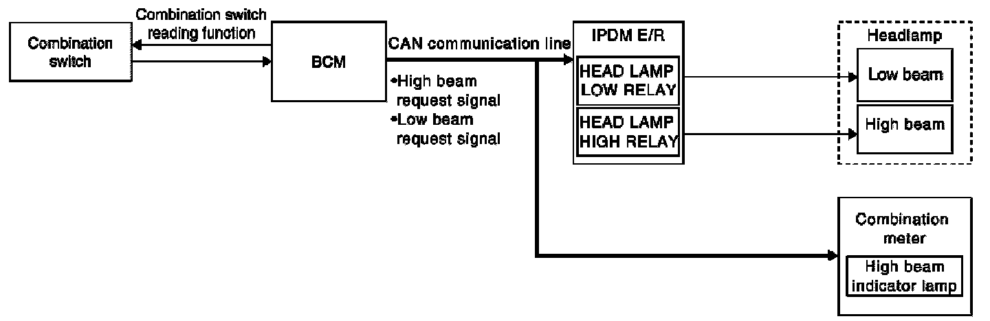 With the lighting switch in the 2ND position and placed in HIGH position, the BCM receives input requesting the headlamp high beams to illuminate. The flash to pass feature can be used any time and also sends a signal to the BCM. This input is communicated to the IPDM E/R via the CAN communication lines. The CPU of the combination meter controls the ON/OFF status off the HIGH BEAM indicator. The CPU of the IPDM E/R controls the headlamp high relay coil which supplies power to the high beam headlamps.