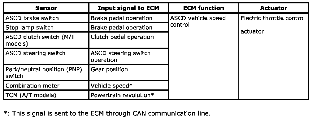 ECM controls throttle angle of electric throttle control actuator to regulate engine speed.Operation status of ASCD is indicated by CRUISE indicator and SET indicator in combination meter. If any malfunction occurs in the ASCD system, it automatically deactivates control.
