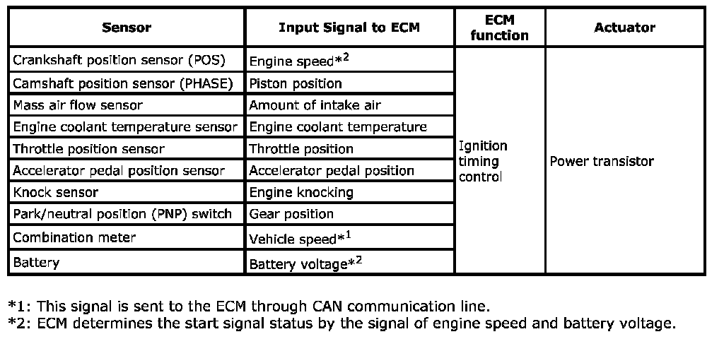 The ECM receives information such as the injection pulse width and camshaft position sensor (PHASE) signal. Computing this information, ignition signals are transmitted to the power transistor.