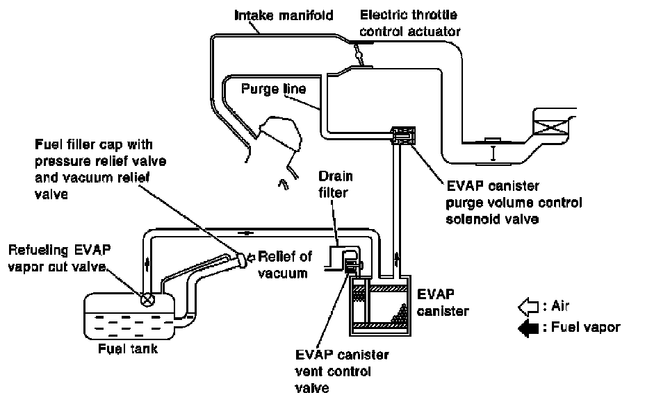 The vapor in the EVAP canister is purged by the air through the purge line to the intake manifold when the engine is operating. EVAP canister purge volume control solenoid valve is controlled by ECM. When the engine operates, the flow rate of vapor controlled by EVAP canister purge volume control solenoid valve is proportionally regulated as the air flow increases.