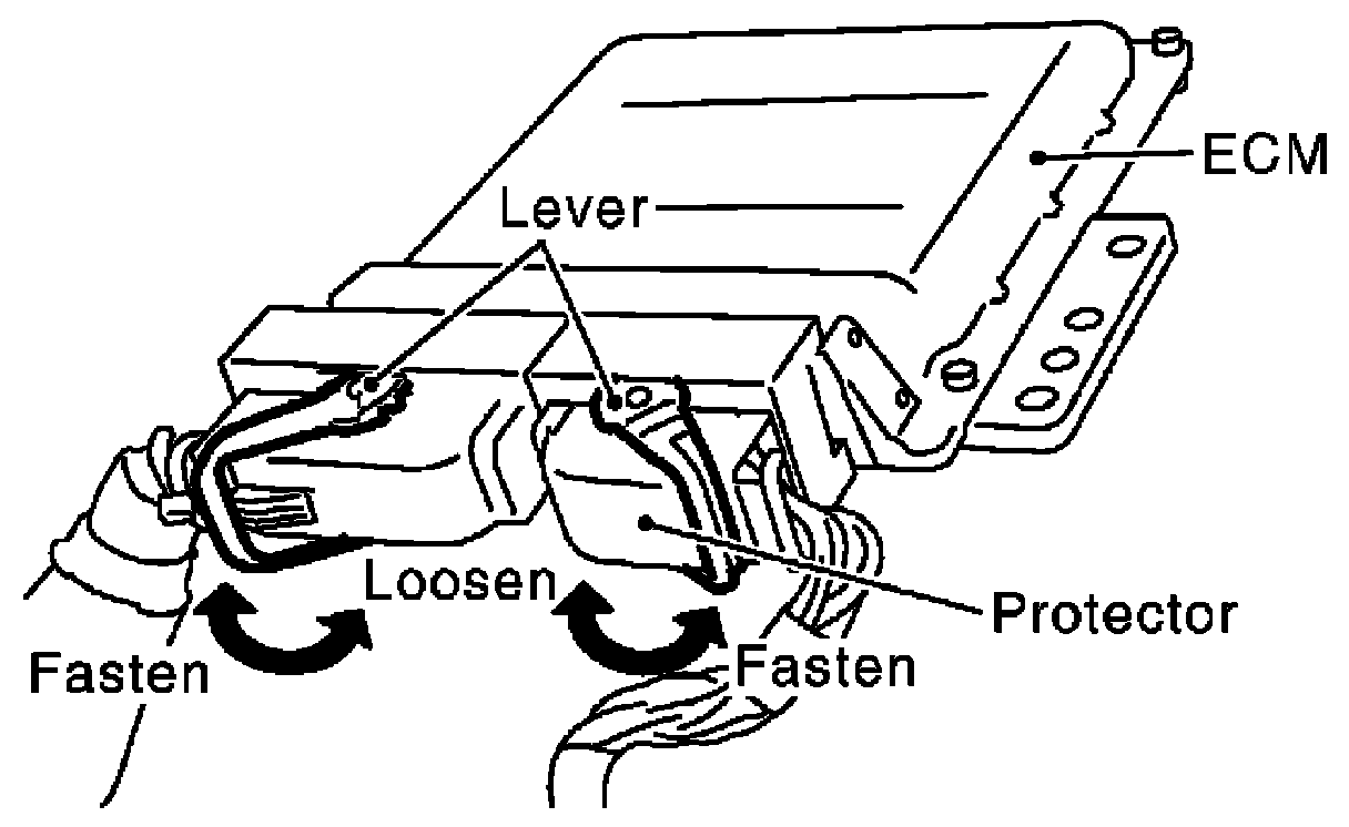 - When connecting ECM harness connector, fasten it securely with a lever as far as it will go as shown in the figure.