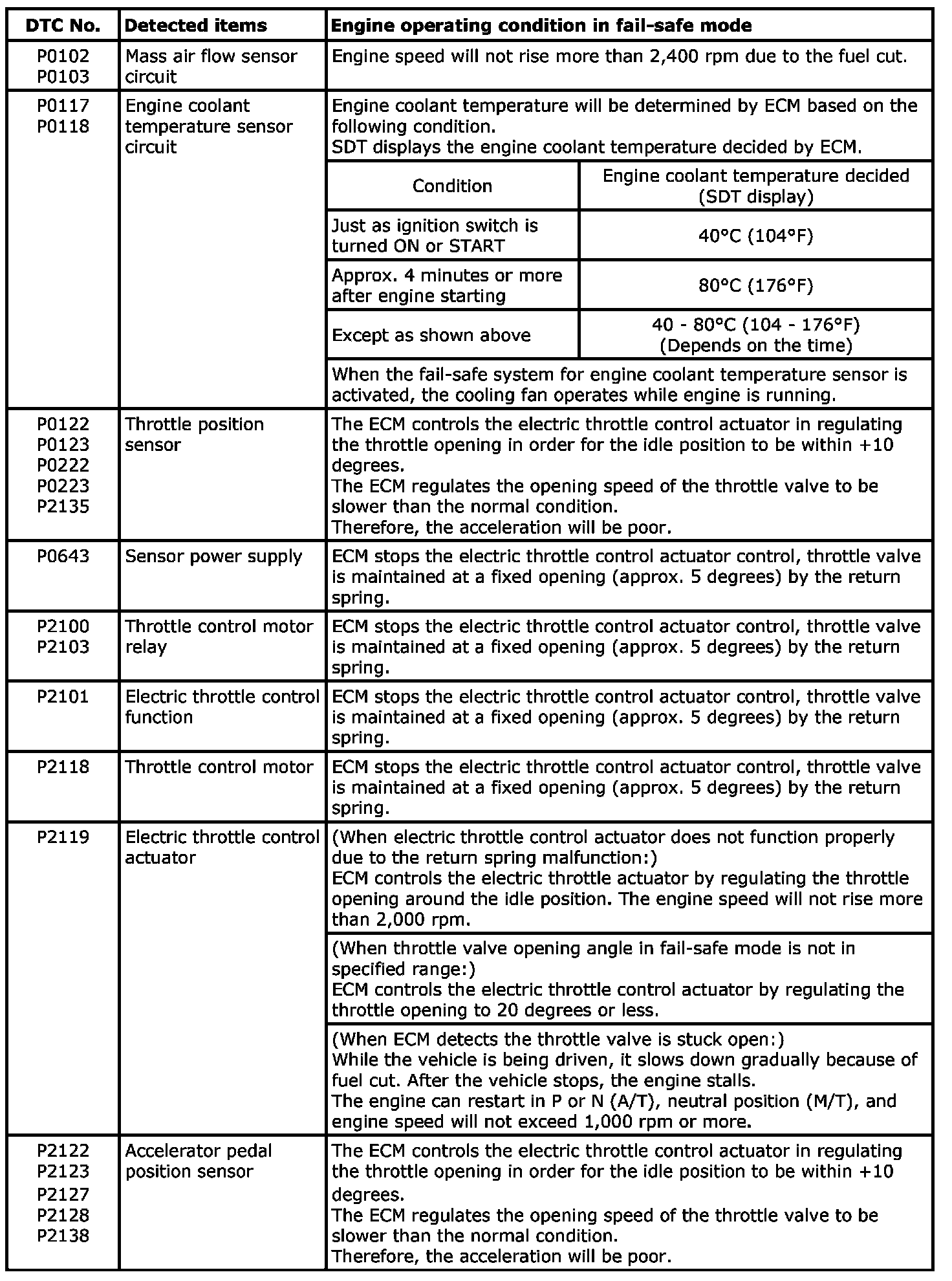 Therefore, when electrical controlled throttle and part of ECM related diagnoses are continuously detected as NG for 5 trips, ECM warns the driver that engine control system malfunctions and MIL circuit is open by means of operating the fail-safe function. The fail-safe function also operates when above diagnoses except MIL circuit are detected, and demands the driver to repair the malfunction.