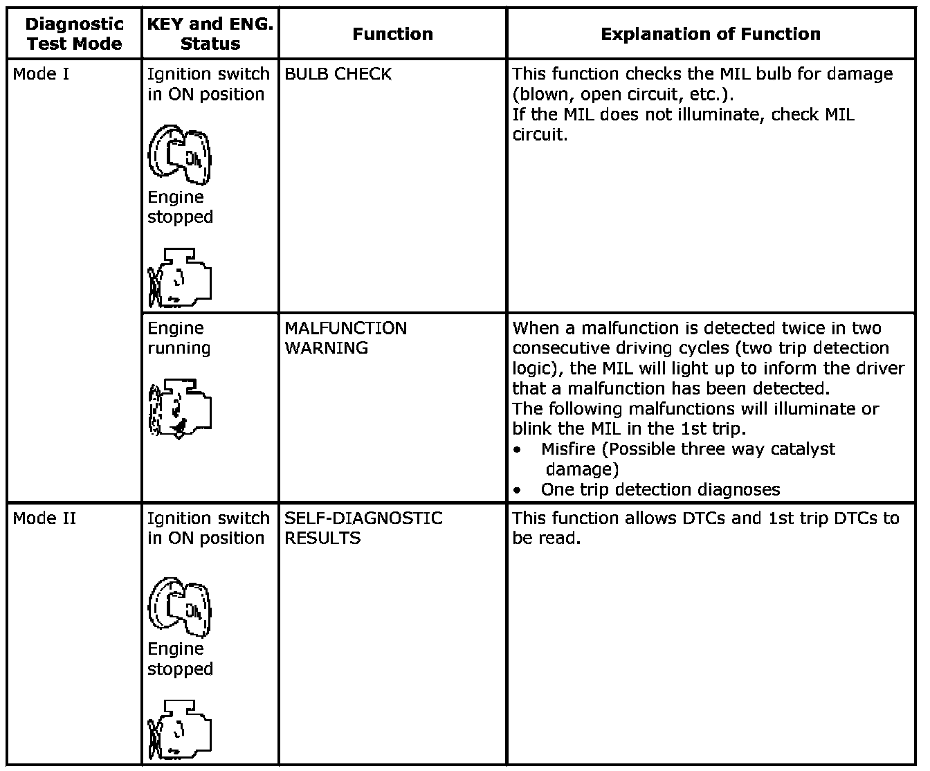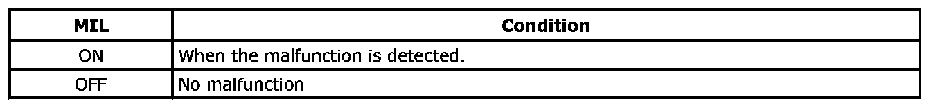 Therefore, when electrical controlled throttle and part of ECM related diagnoses are continuously detected as NG for 5 trips, ECM warns the driver that engine control system malfunctions and MIL circuit is open by means of operating fail-safe function.