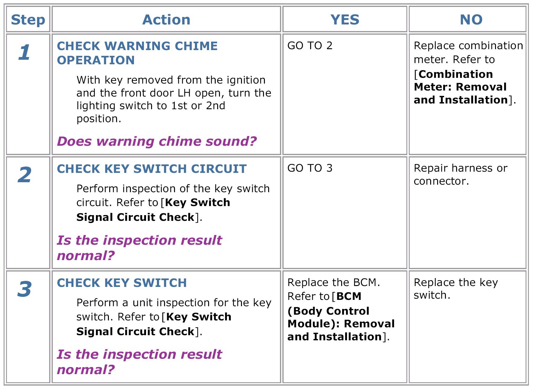 The Key Warning Does Not SoundDescriptionKey warning does not sound even though key is in ignition and front door LH is opened.